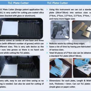 Device: Aluminium plate TLC cutter Made of : Transparent Fiber Glass Pack Includes: Base plate and Three scale plates (2 cm, 2.5 cm, 5 cm), Detail pen knife with 5 blades TLC size: Cut TLC plate (20cm*20cm) into various sizes such as 2*4cm, 2*5cm, 2.5*4cm, 2.5*5cm, 3*4cm, 3*5cm, and many more bigger sizes.
